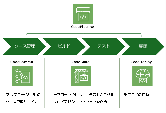 - CodeBuildやCodeDeployなどのサービスを繋ぎ合わせて継続的デリバリーを実現するマネージドサービス